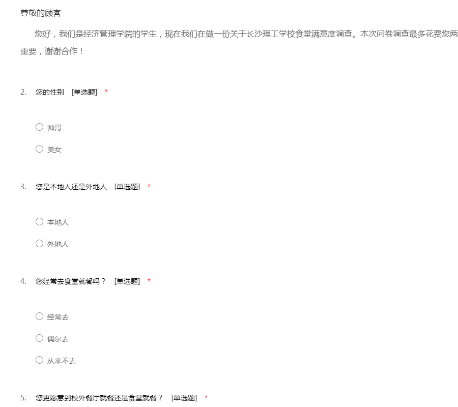 您好,我们是经济管理学院的学生,现在我们在做一份关于长沙理工学校食堂满意度调查。本次问卷调查最多花费您两分钟的时间,您的回答对我们非常的重要,谢谢合作!