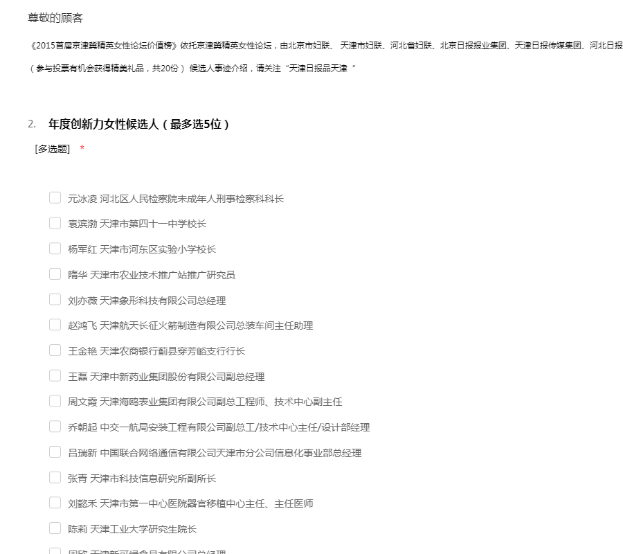 《2015首届京津冀精英女性论坛价值榜》依托京津冀精英女性论坛,由北京市妇联、 天津市妇联、河北省妇联、北京日报报业集团、天津日报传媒集团、河北日报报业集团(三地妇联和三地党报)权威发布。(参与投票有机会获得精美礼品,共20份) 候选人事迹介绍,请关注“天津日报品天津“