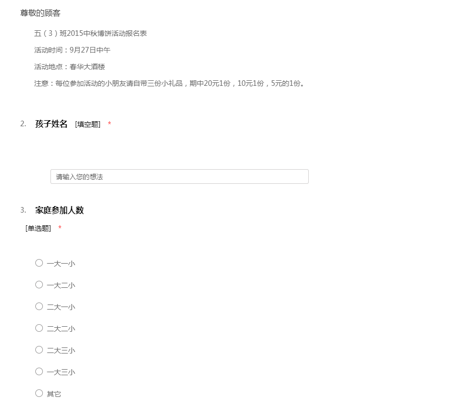 五(3)班2015中秋博饼活动报名表 活动时间:9月27日中午 活动地点:春华大酒楼 注意:每位参加活动的小朋友请自带三份小礼品,期中20元1份,10元1份,5元的1份。