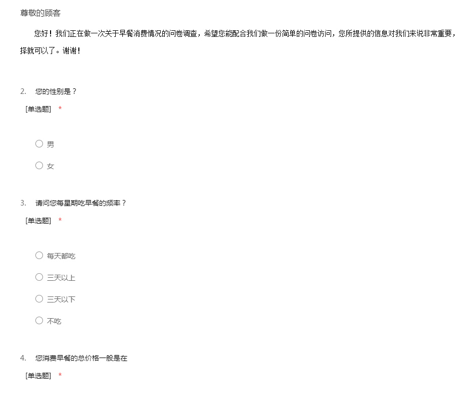 您好!我们正在做一次关于早餐消费情况的问卷调查,希望您能配合我们做一份简单的问卷访问,您所提供的信息对我们来说非常重要,您只需要根据您自己的实际情况做出选择就可以了。谢谢!