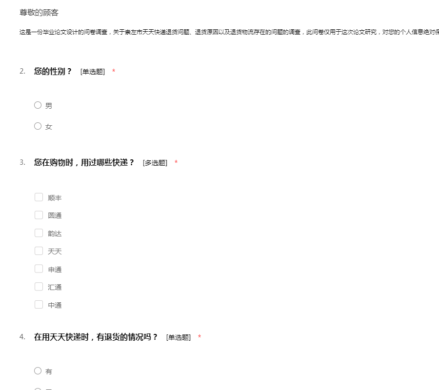 这是一份毕业论文设计的问卷调查,关于崇左市天天快递退货问题、退货原因以及退货物流存在的问题的调查,此问卷仅用于这次论文研究,对您的个人信息绝对保密,请放心填写。谢谢您的合作与支持。