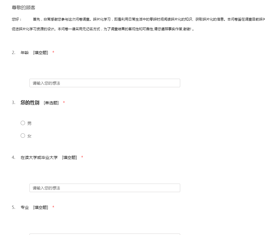 您好: 首先,非常感谢您参与这次问卷调查。碎片化学习,即是利用日常生活中的零碎时间阅读碎片化的知识、获取碎片化的信息。本问卷旨在调查目前碎片化学习的现状、特点及存在的问题,以便更好地促进碎片化学习资源的设计。本问卷一律采用无记名方式,为了调查结果的客观性和可靠性,请您遵照事实作答,谢谢! 。