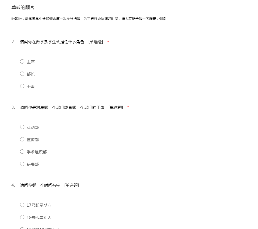啦啦啦,数学系学生会将迎来第一次校外拓展,为了更好地协调好时间,请大家配合做一下调查,谢谢!