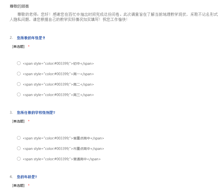 尊敬的老师:您好!感谢您在百忙中抽出时间完成这份问卷。此次调查旨在了解当前地理教学现状,采取不记名形式,结果仅作为学术研究,不涉及您个人隐私问题,请您根据自己的教学实际情况如实填写!祝您工作愉快!