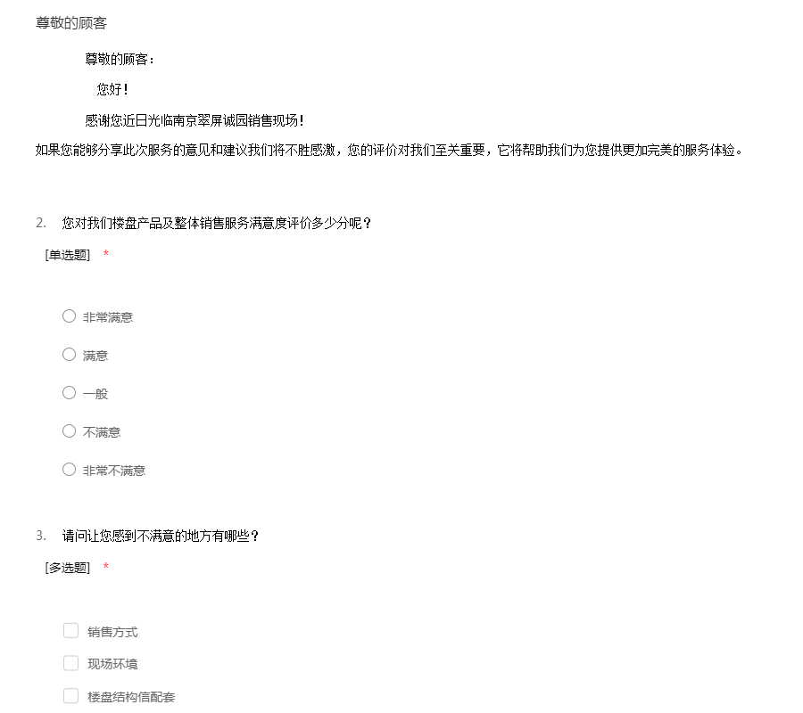 尊敬的顾客: 您好! 感谢您近日光临南京翠屏诚园销售现场!如果您能够分享此次服务的意见和建议我们将不胜感激,您的评价对我们至关重要,它将帮助我们为您提供更加完美的服务体验。