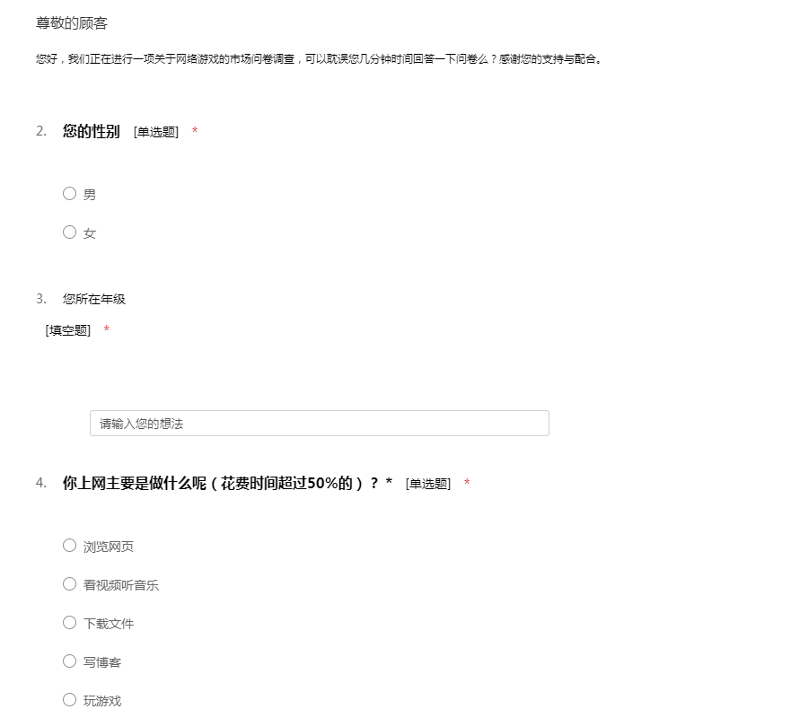 您好,我们正在进行一项关于网络游戏的市场问卷调查,可以耽误您几分钟时间回答一下问卷么?感谢您的支持与配合。