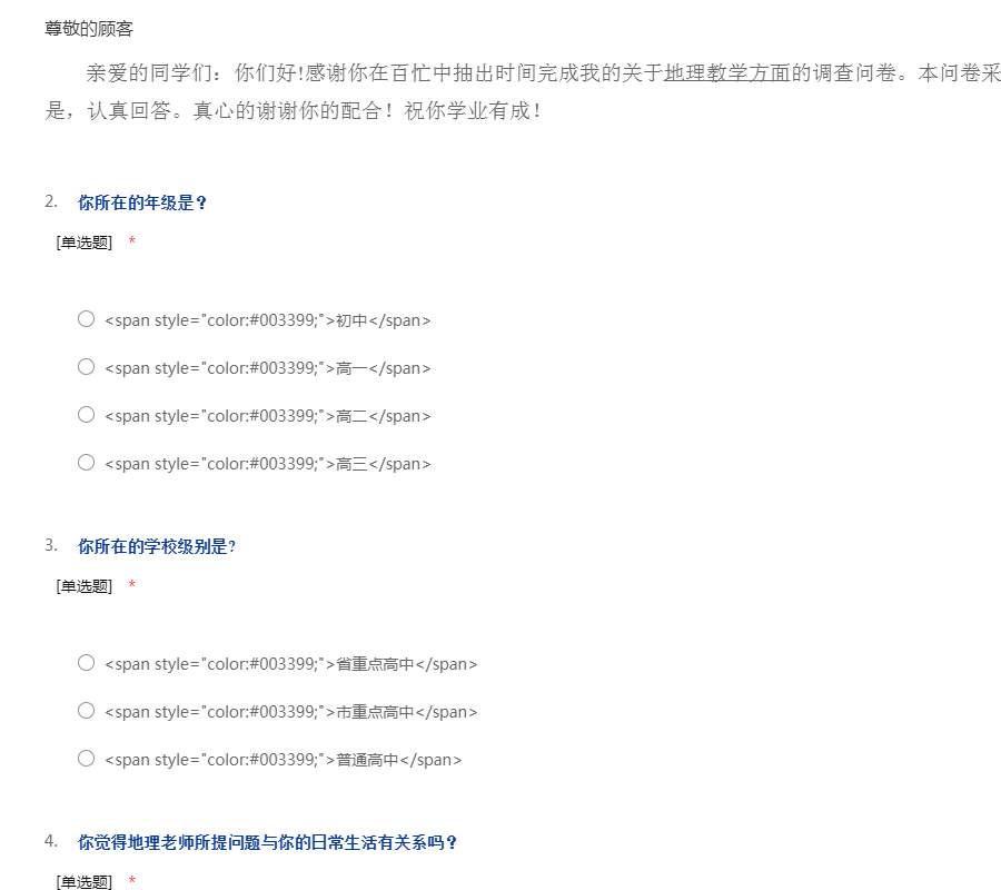 亲爱的同学们:你们好!感谢你在百忙中抽出时间完成我的关于地理教学方面的调查问卷。本问卷采用不记名方式,请你实事求是,认真回答。真心的谢谢你的配合!祝你学业有成!