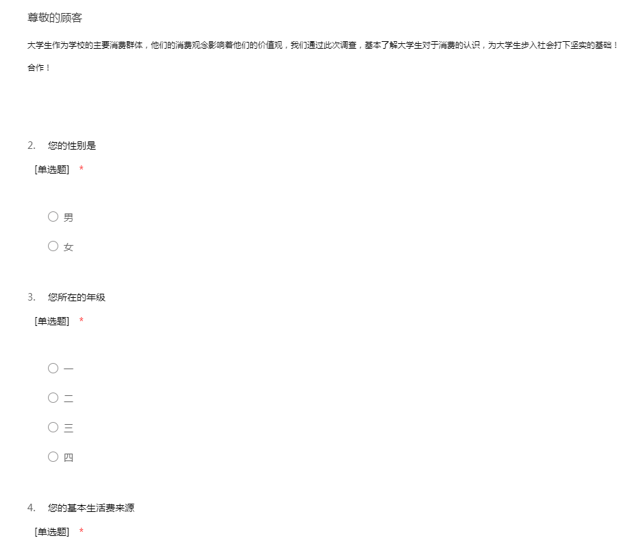 大学生作为学校的主要消费群体,他们的消费观念影响着他们的价值观,我们通过此次调查,基本了解大学生对于消费的认识,为大学生步入社会打下坚实的基础!感谢您成为本次的一员,希望您如实填写。谢谢合作!
