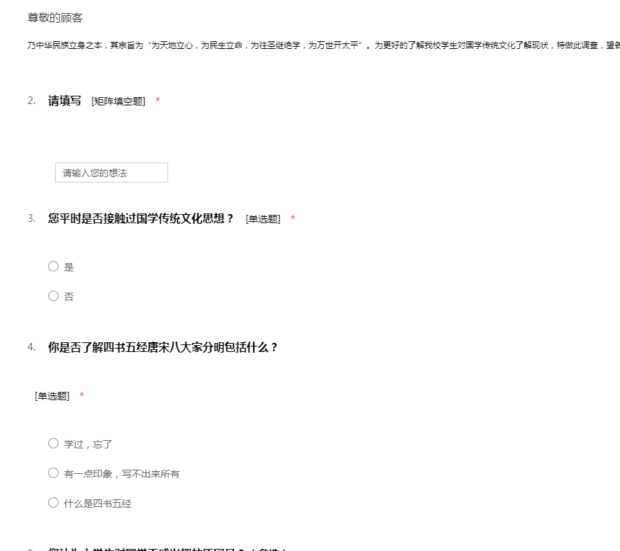 乃中华民族立身之本,其宗旨为“为天地立心,为民生立命,为往圣继绝学,为万世开太平”。为更好的了解我校学生对国学传统文化了解现状,特做此调查,望各位同学能够积极配合!