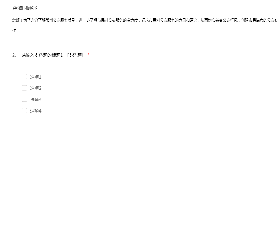 您好!为了充分了解常州公交服务质量,进一步了解市民对公交服务的满意度,征求市民对公交服务的意见和建议,从而切实转变公交行风,创建市民满意的公交系统。特做此次调查,希望得到您的支持,谢谢合作!