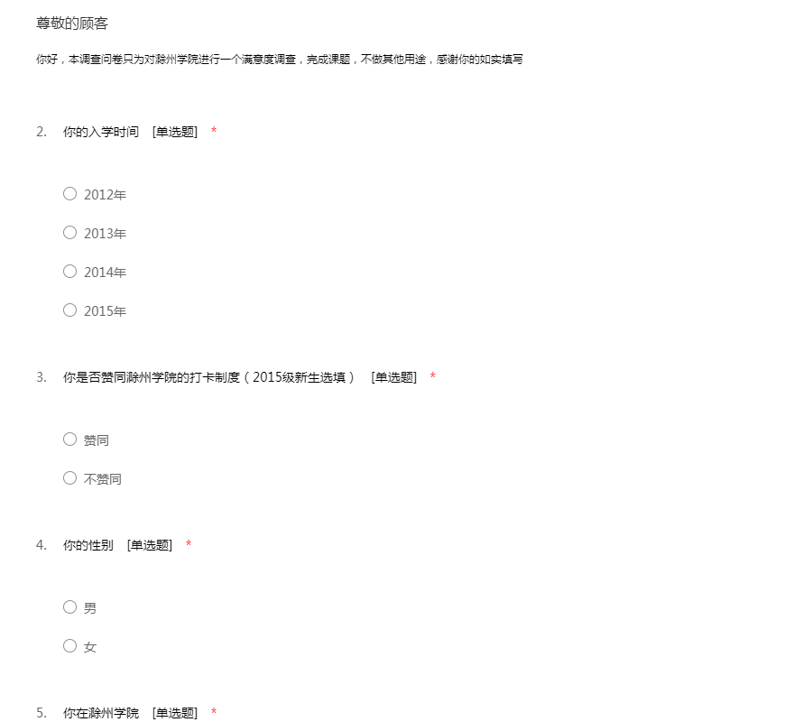 你好,本调查问卷只为对滁州学院进行一个满意度调查,完成课题,不做其他用途,感谢你的如实填写