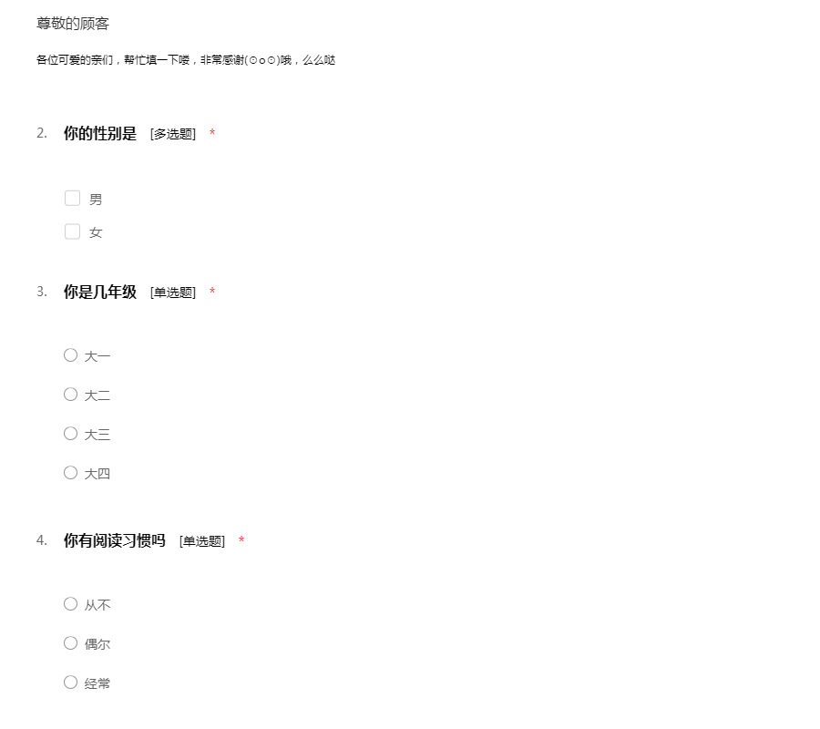 各位可爱的亲们,帮忙填一下喽,非常感谢(⊙o⊙)哦,么么哒