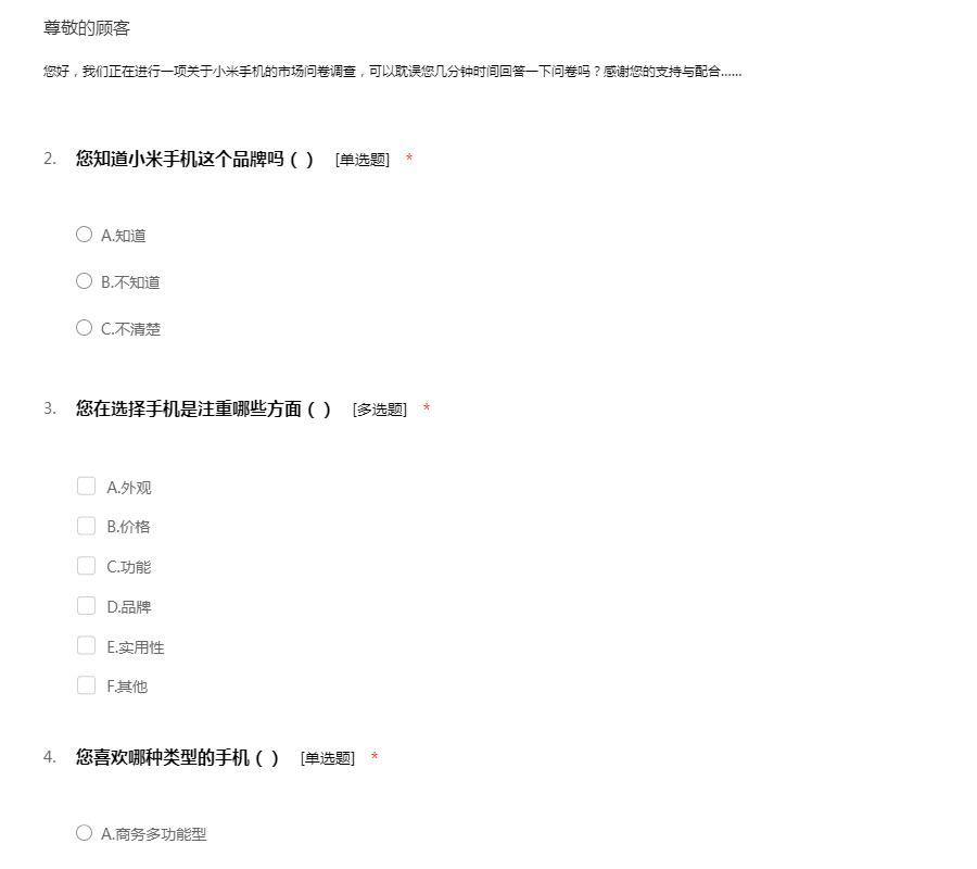 您好,我们正在进行一项关于小米手机的市场问卷调查,可以耽误您几分钟时间回答一下问卷吗?感谢您的支持与配合……