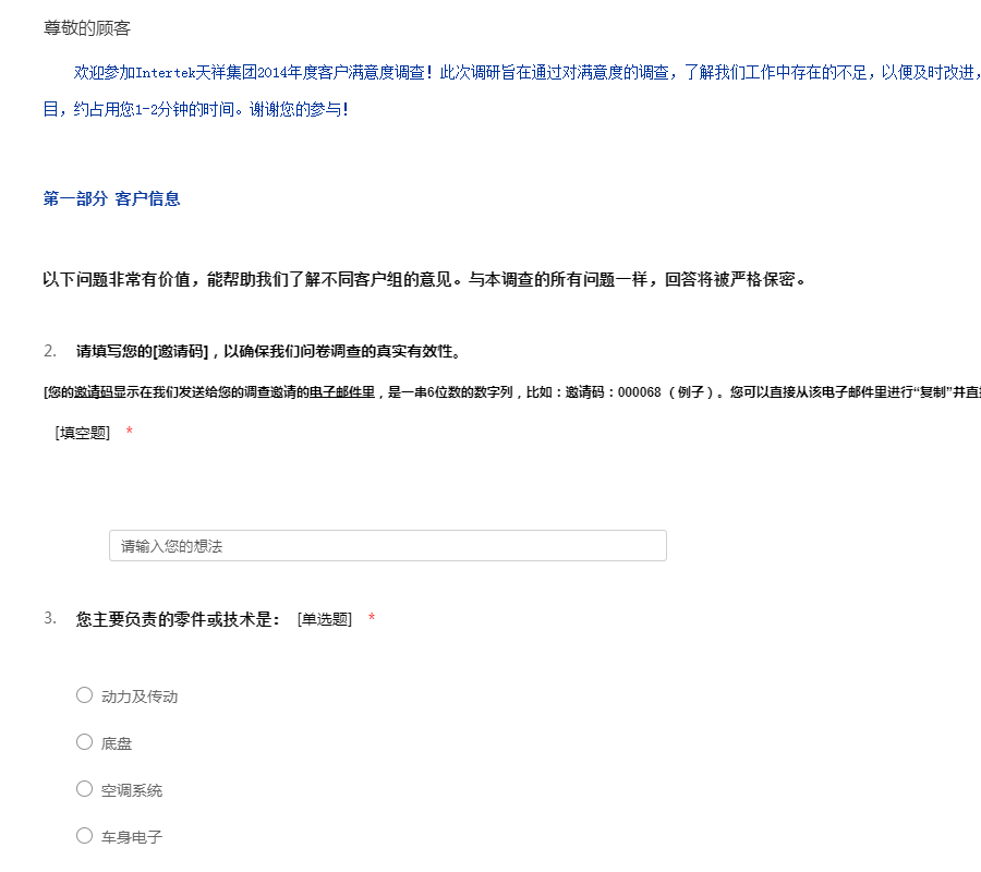 欢迎参加Intertek天祥集团2014年度客户满意度调查!此次调研旨在通过对满意度的调查,了解我们工作中存在的不足,以便及时改进,为您提供更好的服务。本问卷共有8道题目,约占用您1-2分钟的时间。谢谢您的参与!