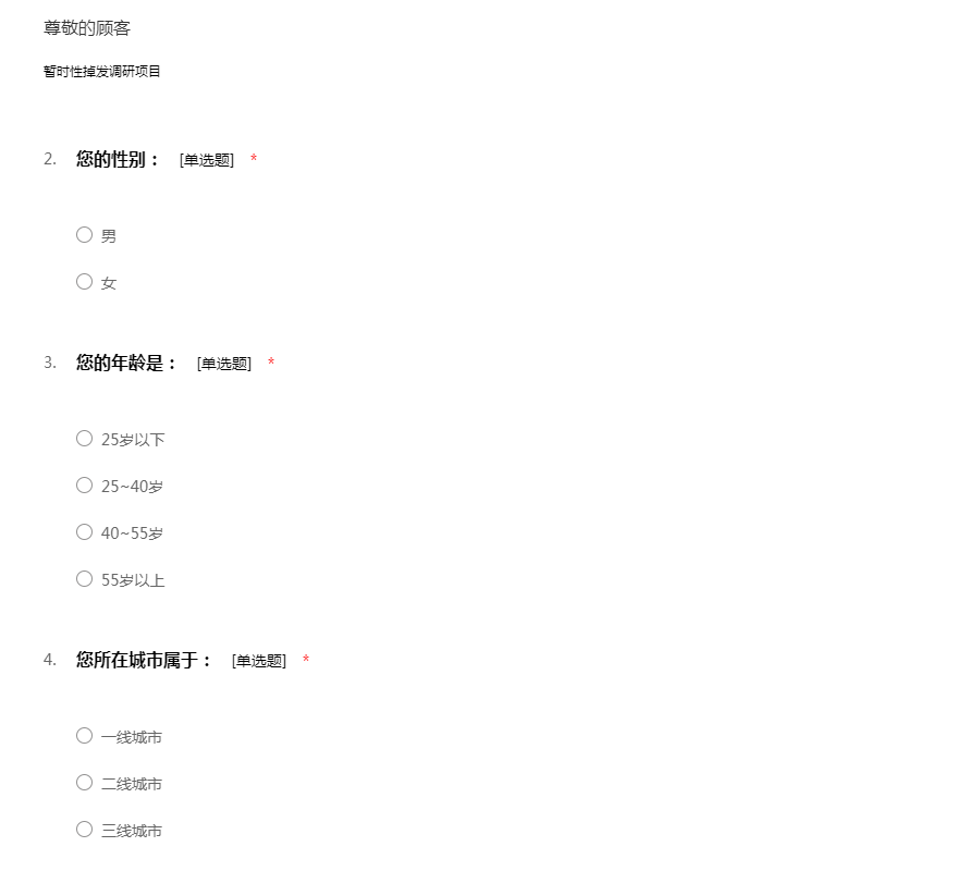亲爱的受访者您好!这份问卷是针对暂时性掉发进行的调研,不涉及隐私,可能需要您花几分钟的时间填写,感谢您的配合和参与。