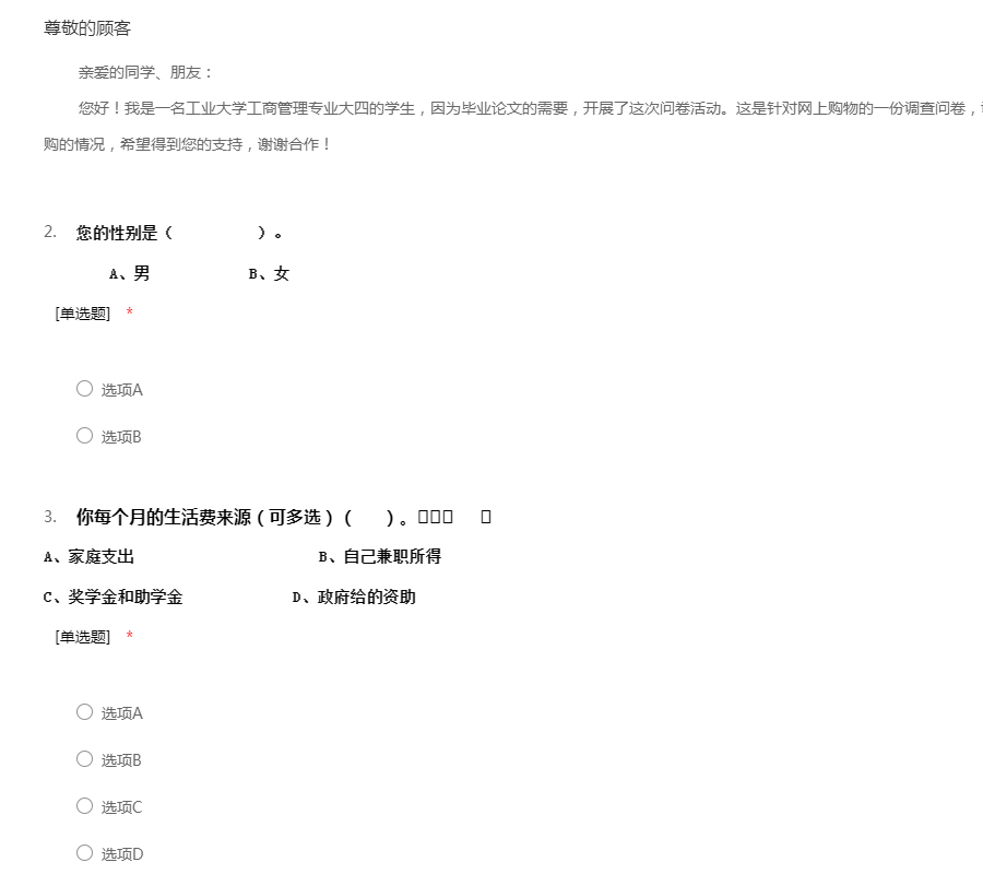 亲爱的同学、朋友: 您好!我是一名工业大学工商管理专业大四的学生,因为毕业论文的需要,开展了这次问卷活动。这是针对网上购物的一份调查问卷,调查的目的是为了了解当代大学生对于网购的情况,希望得到您的支持,谢谢合作!
