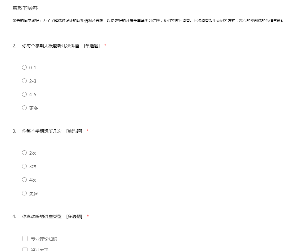 亲爱的同学您好:为了了解你对设计的认知情况及兴趣,以便更好的开展千里马系列讲座,我们特做此调查。此次调查采用无记名方式,忠心的感谢你的合作与帮助。
