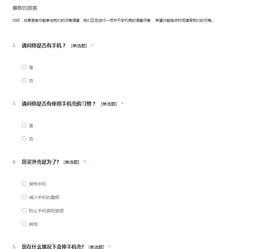 你好,非常感谢你能参与我们的问卷调查,我们正在进行一项关于手机壳的调查问卷 ,希望你能抽点时间填写我们的问卷。