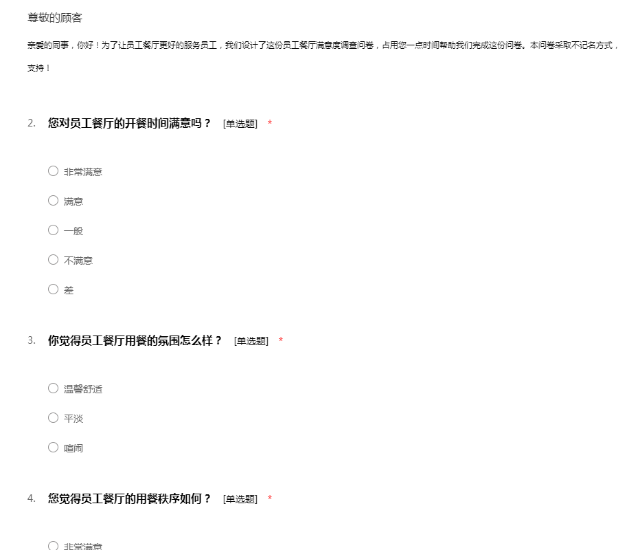 亲爱的同事,你好!为了让员工餐厅更好的服务员工,我们设计了这份员工餐厅满意度调查问卷,占用您一点时间帮助我们完成这份问卷。本问卷采取不记名方式,我们将会认真总结、分析并加以改进。感谢您的支持!