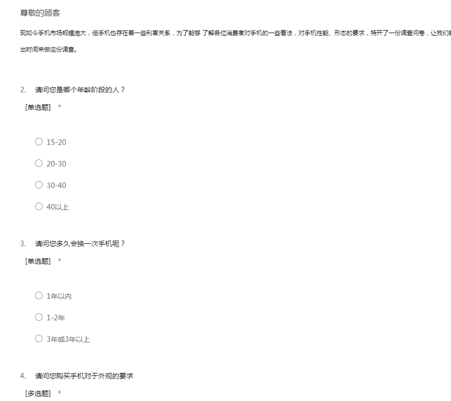 现如今手机市场规模庞大,但手机也存在着一些利害关系,为了能够 了解各位消费者对手机的一些看法,对手机性能、形态的要求,特开了一份调查问卷,让我们能够更好地满足消费者,感谢您能在百忙之中挑出时间来做这份调查。