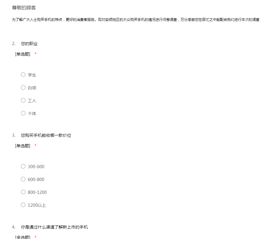 为了解广大人士购买手机的特点,更好的消费者服务。现对安顺地区的大众购买手机的情况进行问卷调查,万分感谢您在百忙之中能配合我们进行本次的调查