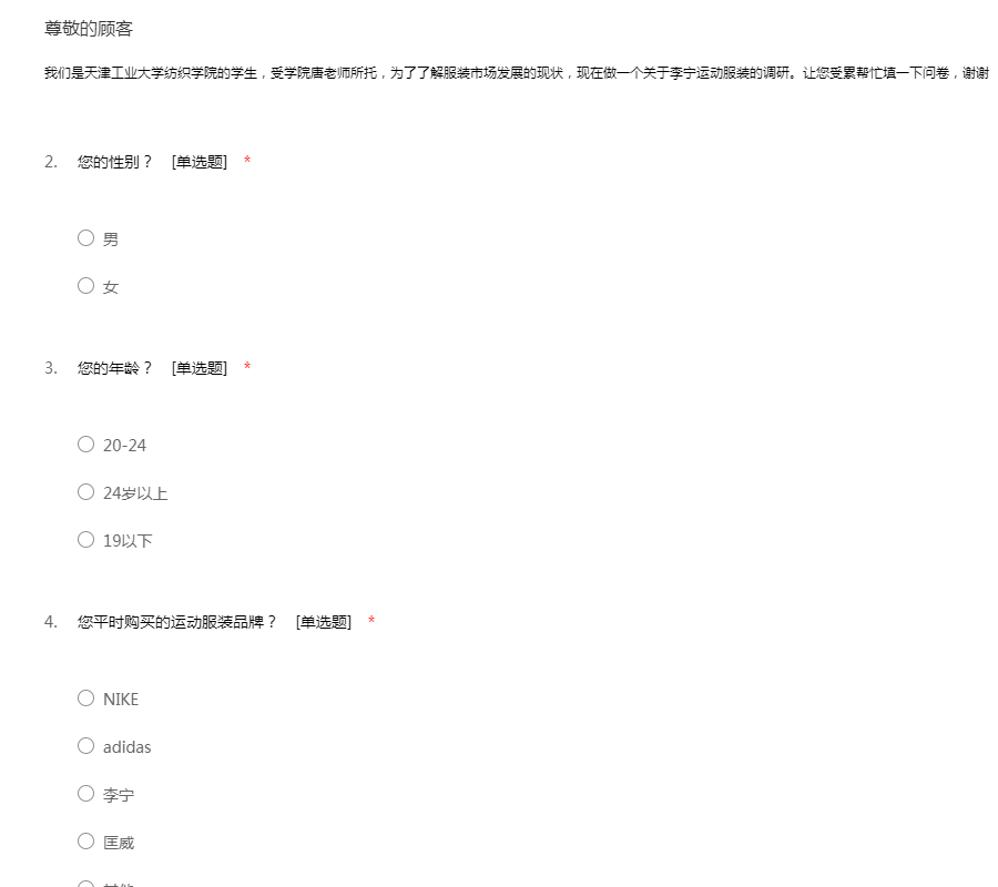 我们是天津工业大学纺织学院的学生,受学院唐老师所托,为了了解服装市场发展的现状,现在做一个关于李宁运动服装的调研。让您受累帮忙填一下问卷,谢谢