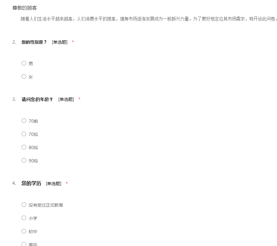 随着人们生活水平越来越高,人们消费水平的提高,健身市场逐渐发展成为一股新兴力量。为了更好地定位其市场需求,特开设此问卷。谢谢合作!