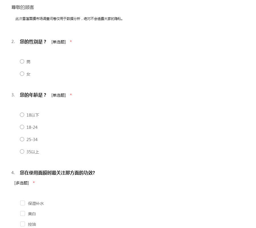此次雪莲面膜市场调查问卷仅用于数据分析,绝对不会透露大家的隐私。