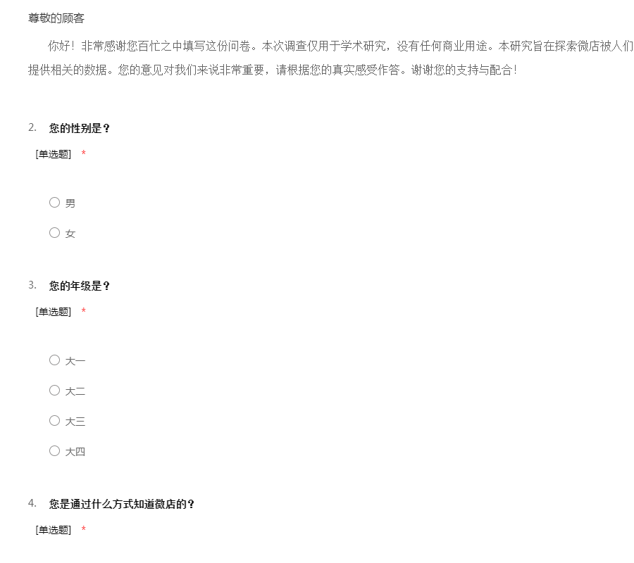 你好!非常感谢您百忙之中填写这份问卷。本次调查仅用于学术研究,没有任何商业用途。本研究旨在探索微店被人们熟识程度及消费心理,为微店的研究提供相关的数据。您的意见对我们来说非常重要,请根据您的真实感受作答。谢谢您的支持与配合!