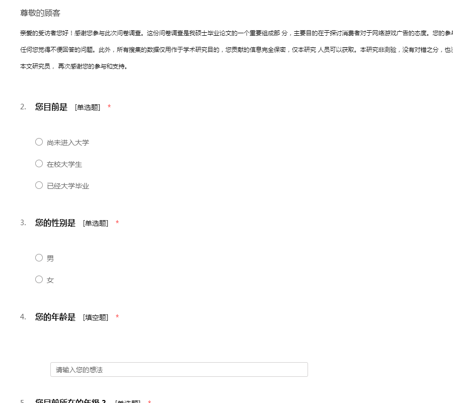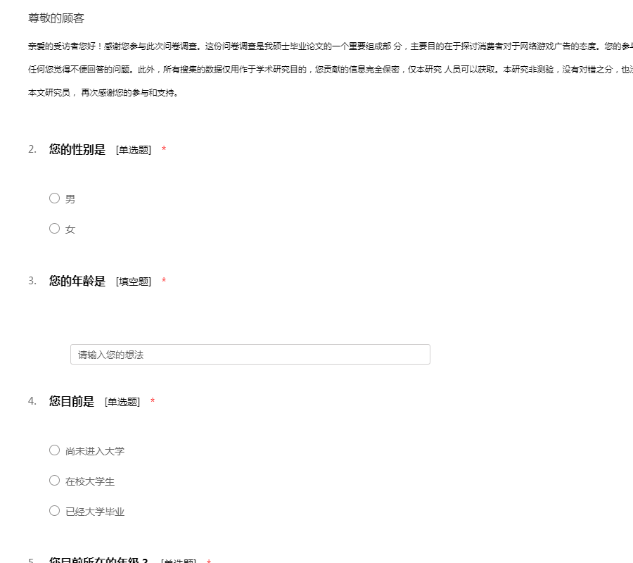 亲爱的受访者您好!感谢您参与此次问卷调查。这份问卷调查是我硕士毕业论文的一个重要组成部 分,主要目的在于探讨消费者对于网络游戏广告的态度。您的参与完全匿名且不涉及个人隐私,您可以拒绝回答 任何您觉得不便回答的问题。此外,所有搜集的数据仅用作于学术研究目的,您贡献的信息完全保密,仅本研究 人员可以获取。本研究非测验,没有对错之分,也没有任何相关风险。 如果您有任何疑问,请联系本文研究员, 再次感谢您的参与和支持。