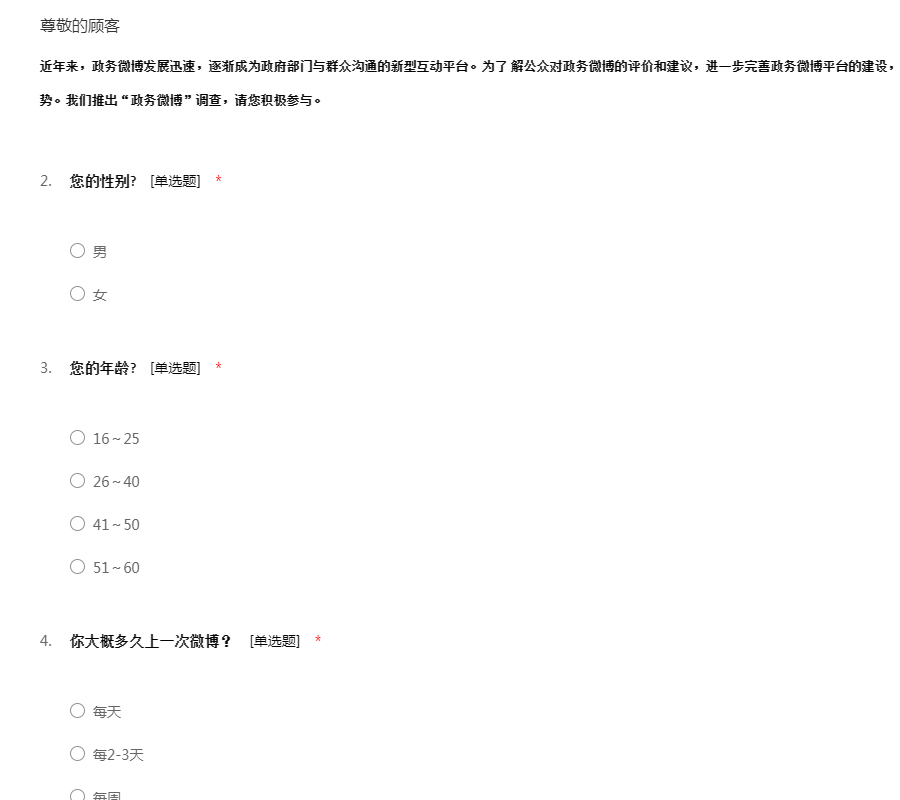 近年来,政务微博发展迅速,逐渐成为政府部门与群众沟通的新型互动平台。为了 解公众对政务微博的评价和建议,进一步完善政务微博平台的建设,更好地发挥其即时、互动、便捷的传播优势。我们推出“政务微博”调查,请您积极参与。