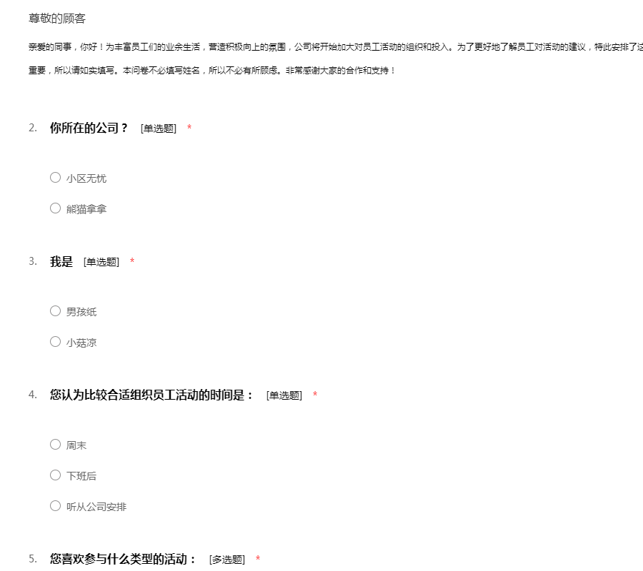 亲爱的同事,你好!为丰富员工们的业余生活,营造积极向上的氛围,公司将开始加大对员工活动的组织和投入。为了更好地了解员工对活动的建议,特此安排了这次的员工活动问卷调查表。你的建议对我们非常重要,所以请如实填写。本问卷不必填写姓名,所以不必有所顾虑。非常感谢大家的合作和支持!