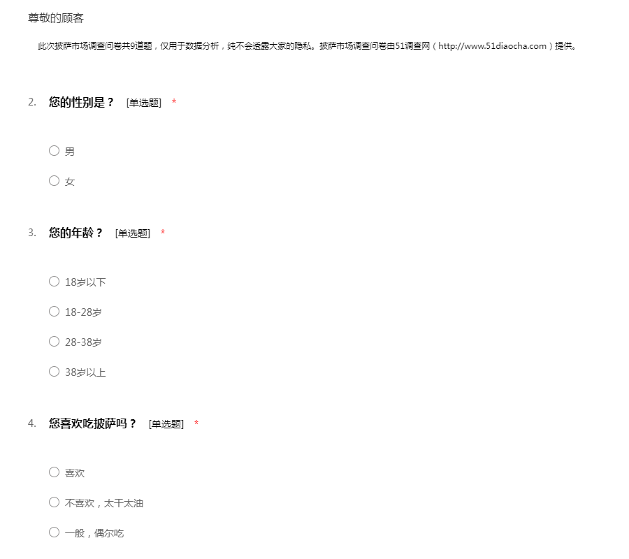 此次披萨市场调查问卷共9道题,仅用于数据分析,纯不会透露大家的隐私。披萨市场调查问卷由51调查网(http://www.51diaocha.com)提供。