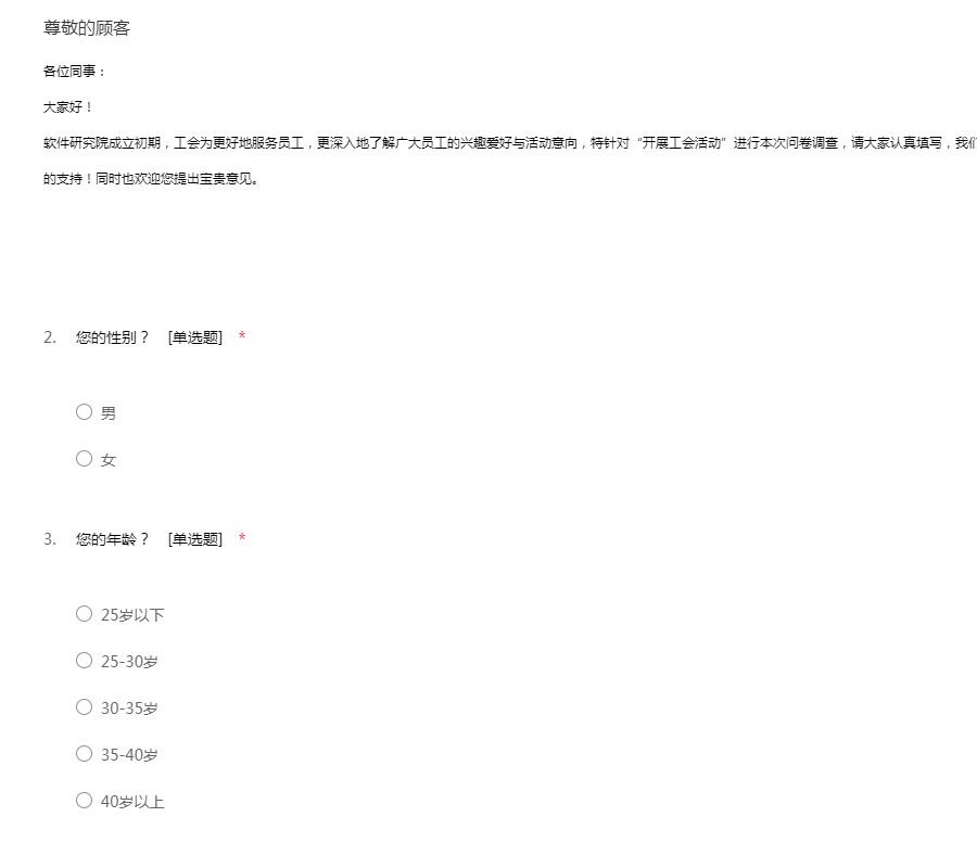 各位同事: 大家好! 软件研究院成立初期,工会为更好地服务员工,更深入地了解广大员工的兴趣爱好与活动意向,特针对“开展工会活动”进行本次问卷调查,请大家认真填写,我们将根据调查结果组织开展相应活动。非常感谢您的支持!同时也欢迎您提出宝贵意见。