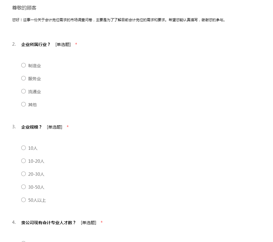 您好!这事一份关于会计岗位需求的市场调查问卷,主要是为了了解目前会计岗位的需求和要求。希望您能认真填写,谢谢您的参与。