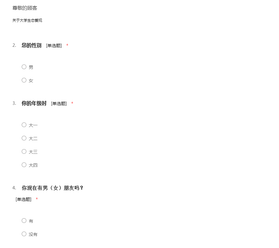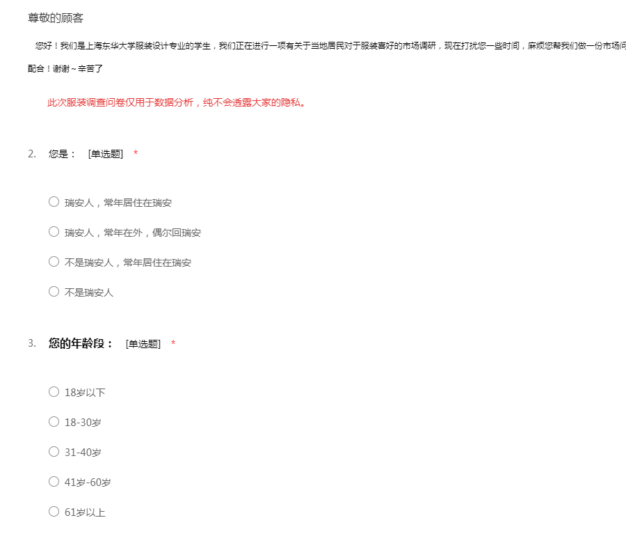您好!我们是上海东华大学服装设计专业的学生,我们正在进行一项有关于当地居民对于服装喜好的市场调研,现在打扰您一些时间,麻烦您帮我们做一份市场问卷,您的答案将对我们很有帮助。非常感谢您的配合!谢谢~辛苦了 此次服装调查问卷仅用于数据分析,纯不会透露大家的隐私。