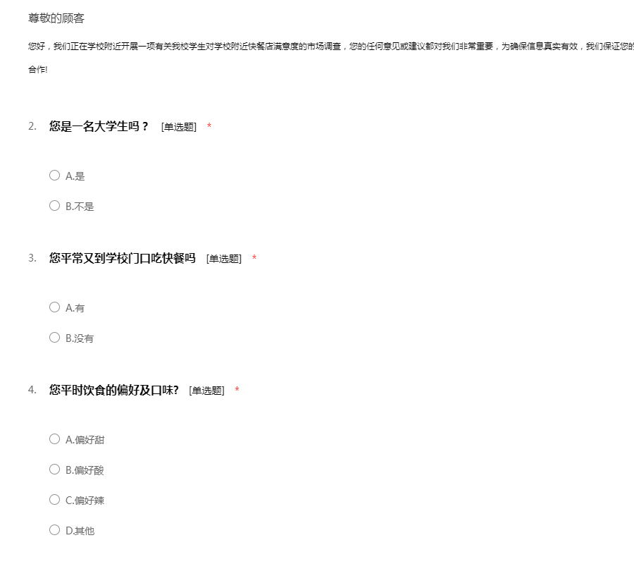 您好,我们正在学校附近开展一项有关我校学生对学校附近快餐店满意度的市场调查,您的任何意见或建议都对我们非常重要,为确保信息真实有效,我们保证您的个人资料绝对保密。敬请您如实填报!谢谢您的合作!