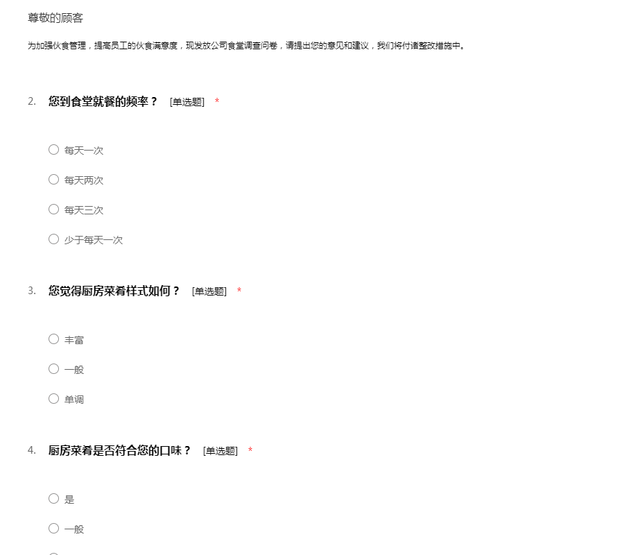 为加强伙食管理,提高员工的伙食满意度,现发放公司食堂调查问卷,请提出您的意见和建议,我们将付诸整改措施中。