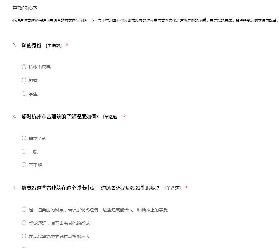 我想通过古建筑保护问卷调查的方式向您了解一下,关于杭州国际化大都市发展的进程中与古老文化及建筑之间的矛盾,有关您的看法,希望得到您的支持与配合。谢谢您的合作!
