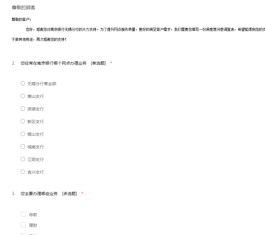 尊敬的客户: 您好,感谢您对南京银行无锡分行的大力支持。为了提升网点服务质量,更好的满足客户需求,我们需要您填写一份满意度问卷调查表,希望能得到您的支持!本调查问卷所收集的数据仅用于数据分析,不做其他用途,再次感谢您的支持!