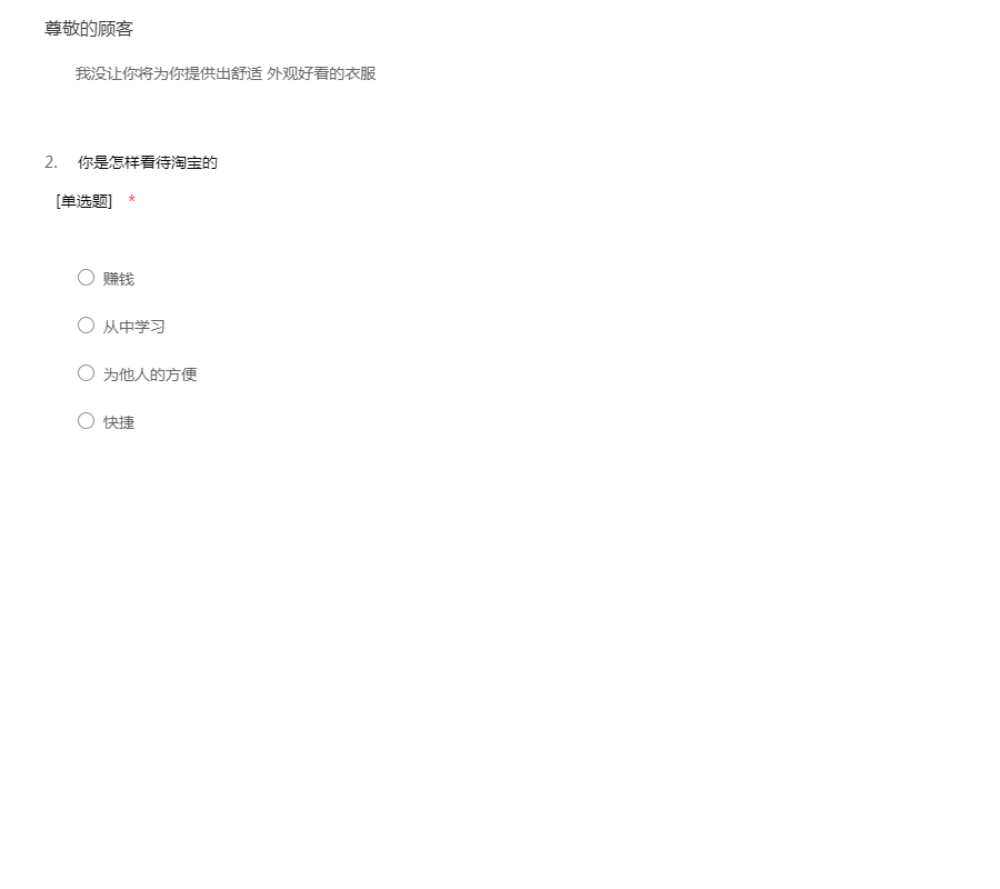 此次服装调查问卷仅用于数据分析,纯不会透露大家的隐私。服装调查问卷由51调查网(http://www.51diaocha.com)提供。