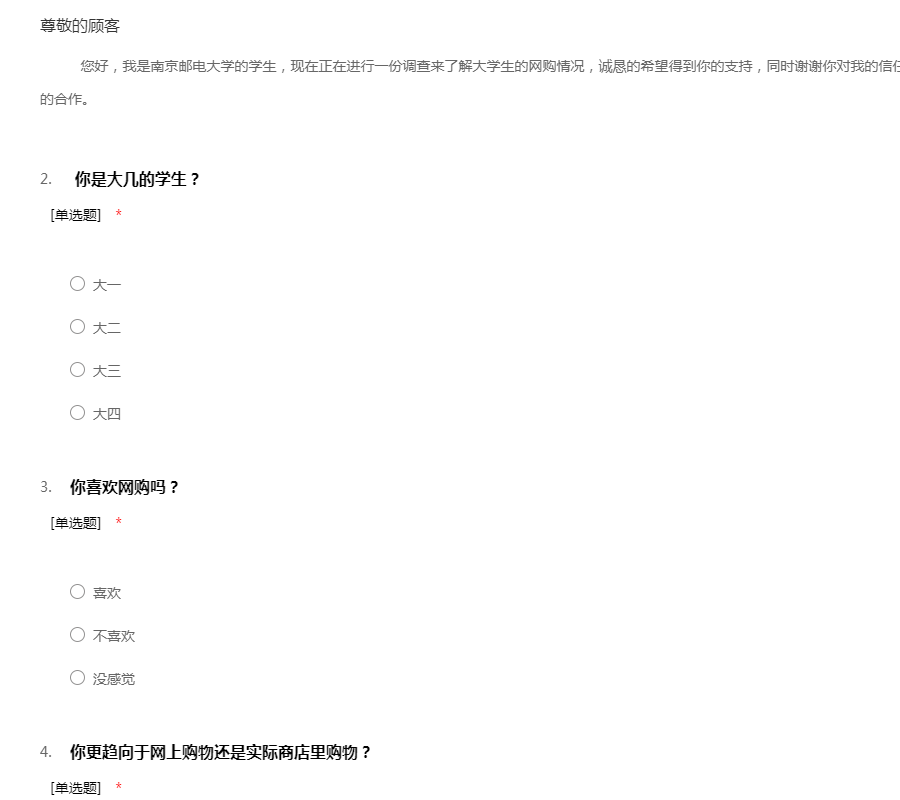您好,我是南京邮电大学的学生,现在正在进行一份调查来了解大学生的网购情况,诚恳的希望得到你的支持,同时谢谢你对我的信任,对于你的个人隐私将严格保密,谢谢的合作。