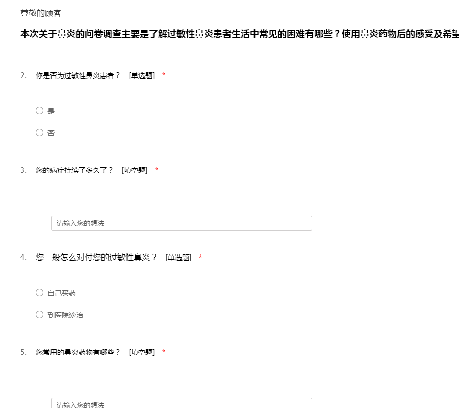 本次关于鼻炎的问卷调查主要是了解过敏性鼻炎患者生活中常见的困难有哪些?使用鼻炎药物后的感受及希望专业机构能够给予的一些帮助。
