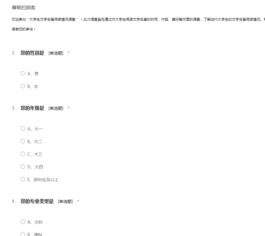 欢迎参加“大学生文学名著阅读情况调查 ”!此次调查旨在通过对大学生阅读文学名著的时间、内容、喜好等方面的调查,了解当代大学生的文学名著阅读情况。希望您抽出一点时间为我们填写这份调查问卷,感谢您的参与!