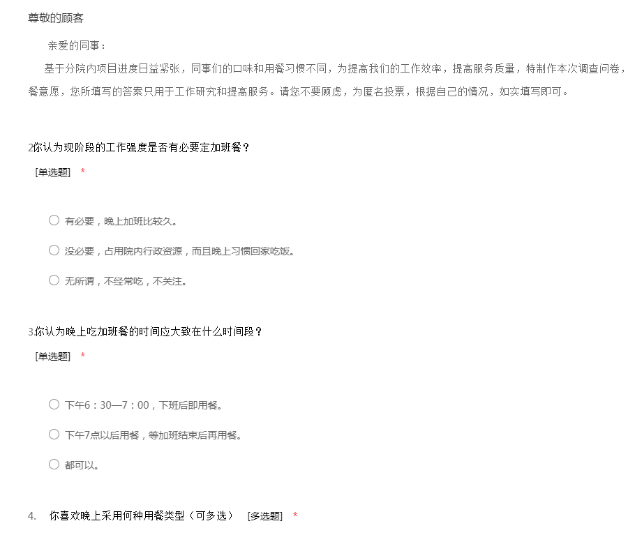 亲爱的同事: 基于分院内项目进度日益紧张,同事们的口味和用餐习惯不同,为提高我们的工作效率,提高服务质量,特制作本次调查问卷,本次问卷旨在调查员工的加班现状及用餐意愿,您所填写的答案只用于工作研究和提高服务。请您不要顾虑,为匿名投票,根据自己的情况,如实填写即可。