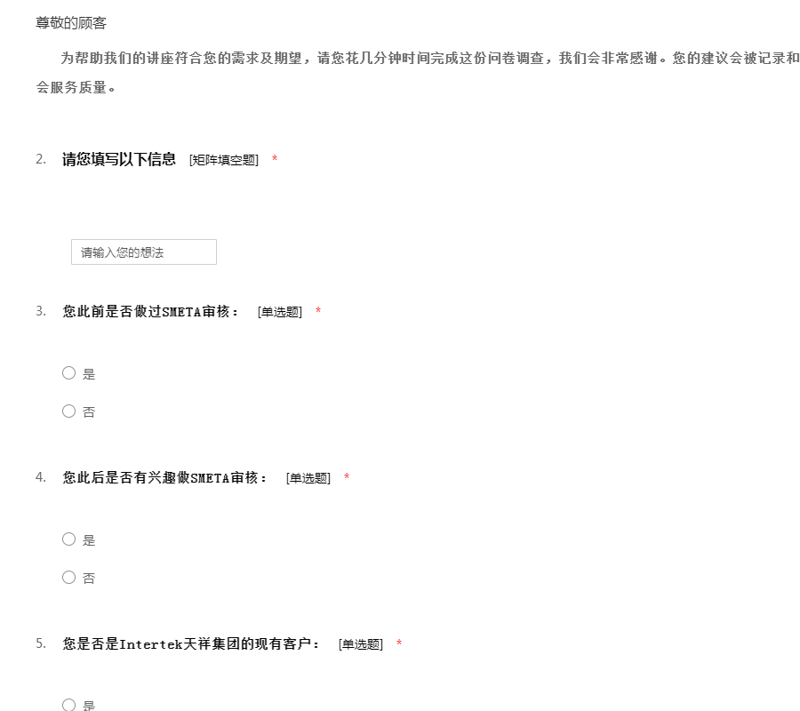 工作环境:包含工作管理环境和周边的自然环境,还有工作的安全性:该要项的设置目的是用于测量您的员工如何看待诸如他们的工作环境条件、设备工具的质量以及在工作场所当中对于安全的整体意识等方面问题。每一个组织都要对员工的健康和安全负责。一个缺乏安全保障的工作环境将导致各类事故、法律诉讼和工作延迟等一系列问题。所有这些事故可能给您的组织带来非常巨大的损失。该要项下的所有问题将调查您的员工对于公司的设施工具是否满意,他们是否相信工作是在以一种安全的方式进行,以及提供给他们的工具设备是否能够满足他们去安全成功地完成工作。员工工作环境满意度问卷模板由我要调查网(http://www.51diaocha.com)提供。