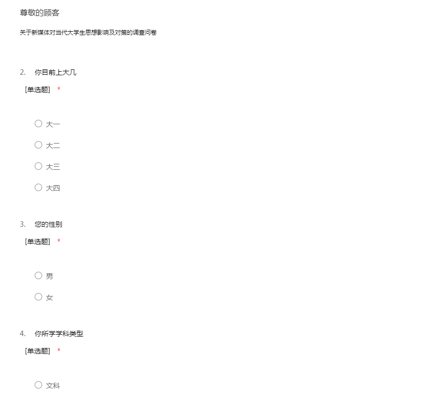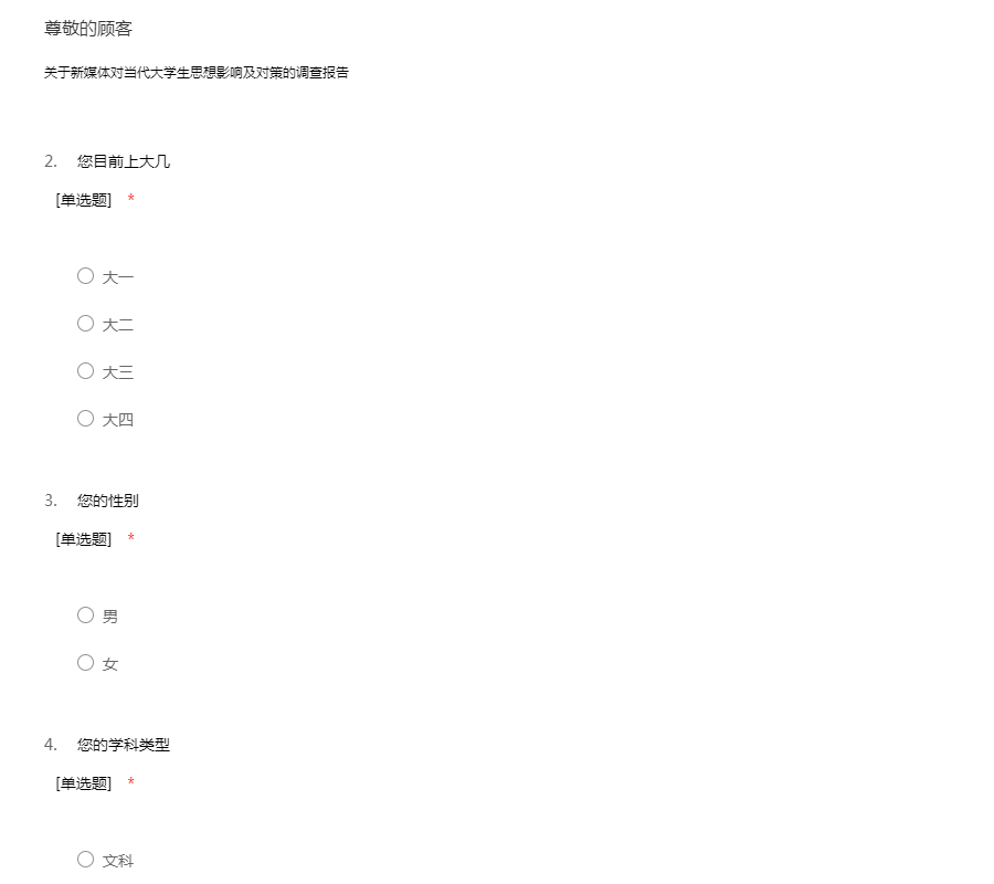 亲爱的同学: 您好! 我们正在进行一项关于新媒体对当代大学生思想影响的问卷调查,我们希望通过这次调查对新媒体在发展过程中出现的一些问题提供一些科学的参考及对策,从而促进新媒体更加健康蓬勃的发展! 本次调查主要针对在读大学生,无须填写姓名,请根据实际情况认真作答,您的回答将直接影响本次调查的可信度和有效性。 对于您的配合和支持我们表示由衷的感谢!