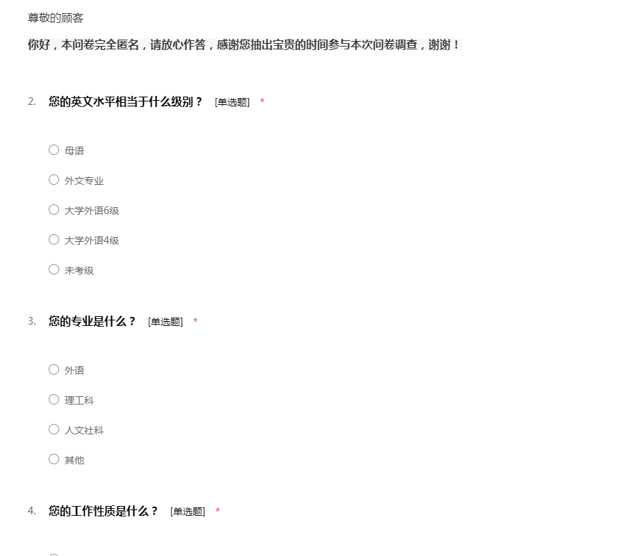 你好,本问卷完全匿名,请放心作答,感谢您抽出宝贵的时间参与本次问卷调查,谢谢!