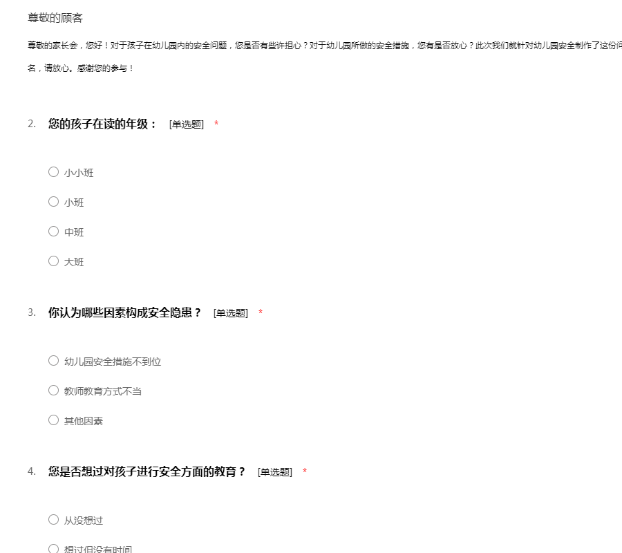 尊敬的家长会,您好!对于孩子在幼儿园内的安全问题,您是否有些许担心?对于幼儿园所做的安全措施,您有是否放心?此次我们就针对幼儿园安全制作了这份问卷调查表,需要得到您的宝贵建议。问卷不记名,请放心。感谢您的参与!