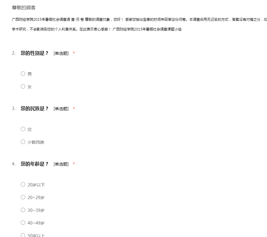 广西财经学院2015年暑假社会调查调 查 问 卷 尊敬的调查对象,您好! 感谢您抽出宝贵的时间来回答这份问卷。本调查采用无记名的方式,答案没有对错之分,如实回答就是最好回答。我们保证您的答案仅用于学术研究,不会影响到您的个人利害关系。在此表示衷心感谢! 广西财经学院2015年暑假社会调查课题小组